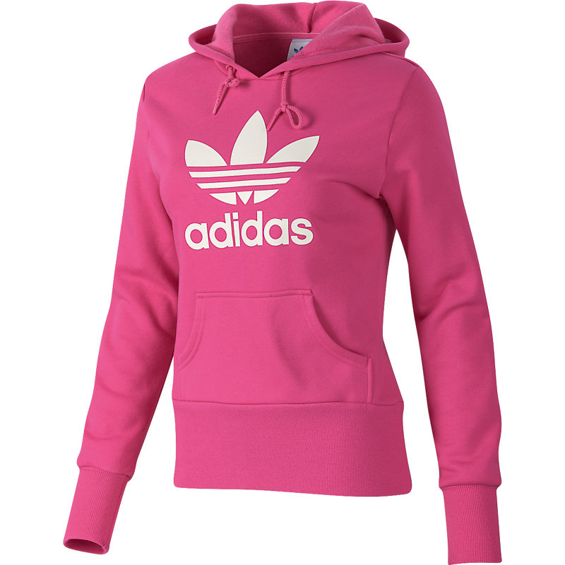 This classic women's adidas Originals Trefoil Logo Hoodie is made of comfortable fleece with a drawcord hood, a kangaroo pocket and an outsize logo. The pullover hoodie also features extra-long cuffs and hem for feminine style.
